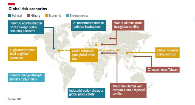 La unidad de inteligencias económica – UIE – de The Economist presenta su reporte de puntos de riesgos en el 2024.