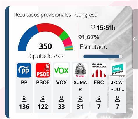 El escrutinio de la noche electoral fue de infarto y sorprendió a todas las encuestas, con un resultado mucho mejor de lo esperado para el PSOE (122 escaños, subiendo 2, mientras que ninguna encuesta del 17J le daba más de 110 escaños) y mucho peor para el PP (sacó 136, subiendo 47, pero casi todas las encuestas, diez sobre catorce, le daban al menos 140 o más), pésima para Vox (baja de 52 a 33 escaños y no es decisivo) y razonables para Sumar (pasa de los 38 de sus precursores a 31).