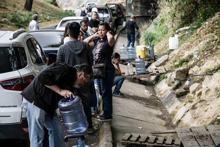 Personas recogiendo agua liberada a través de una tubería junto a una carretera durante una escasez de agua en la capital, Caracas, en 2019. SOPA Images Limited / Alamy Stock Photo