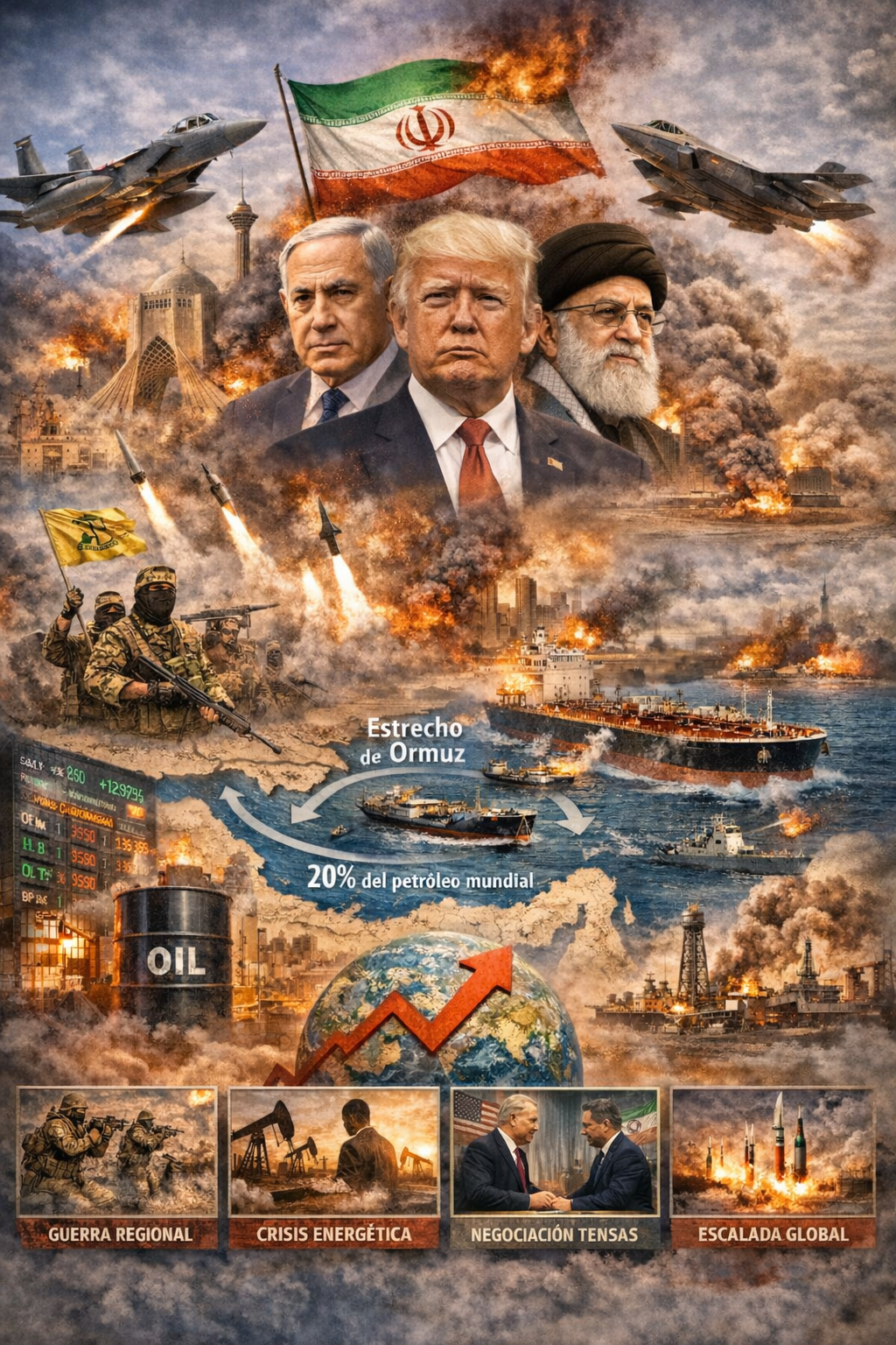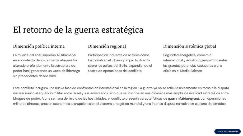 El escenario actual revela una convergencia de dimensiones que trascienden la lógica militar inmediata. En primer lugar, la dimensión política interna iraní, profundamente alterada por la muerte del líder supremo Ali Khamenei en el contexto de los primeros ataques. En segundo término, la dimensión regional, marcada por la participación indirecta de actores como Hezbollah en el Líbano y por el impacto sobre los países del Golfo. Finalmente, la dimensión sistémica global, donde la seguridad energética, el comercio internacional y el equilibrio geopolítico entre las grandes potencias vuelven a quedar expuestos a una crisis en el Medio Oriente.