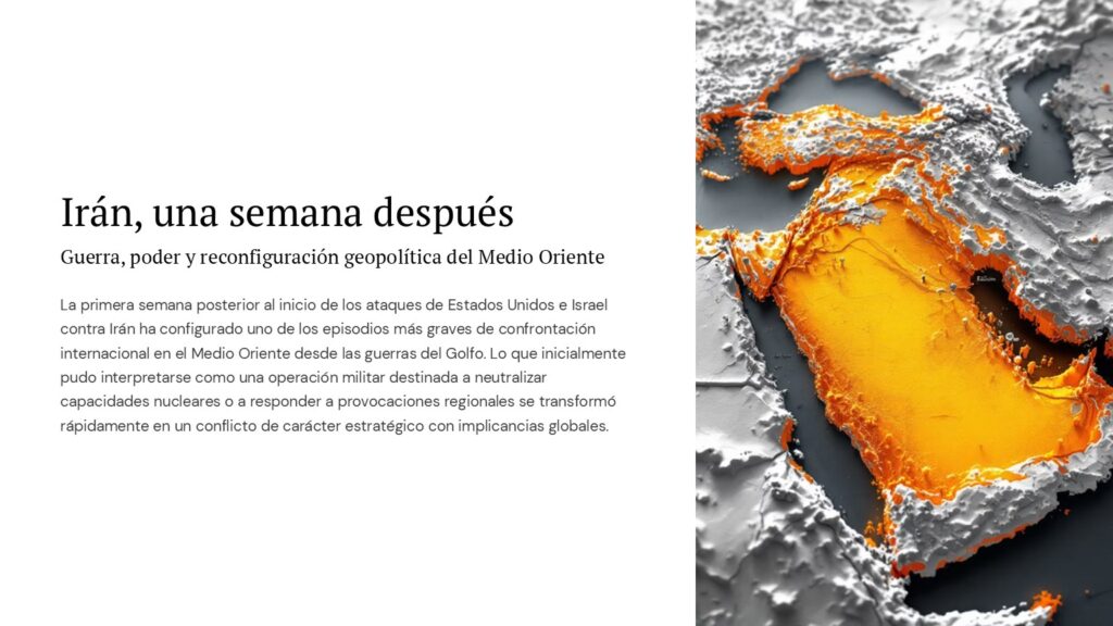 La primera semana posterior al inicio de los ataques de Estados Unidos e Israel contra Irán ha configurado uno de los episodios más graves de confrontación internacional en el Medio Oriente desde las guerras del Golfo. Lo que inicialmente pudo interpretarse como una operación militar destinada a neutralizar capacidades nucleares o a responder a provocaciones regionales se transformó rápidamente en un conflicto de carácter estratégico con implicancias globales.