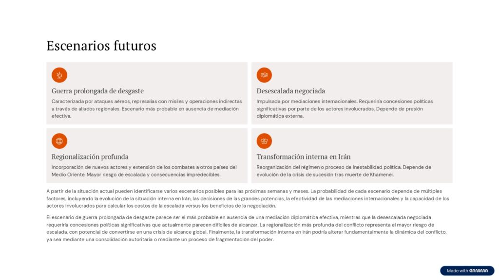 El segundo escenario es una desescalada negociada, impulsada por mediaciones internacionales. Este escenario requeriría concesiones políticas significativas por parte de los actores involucrados.
