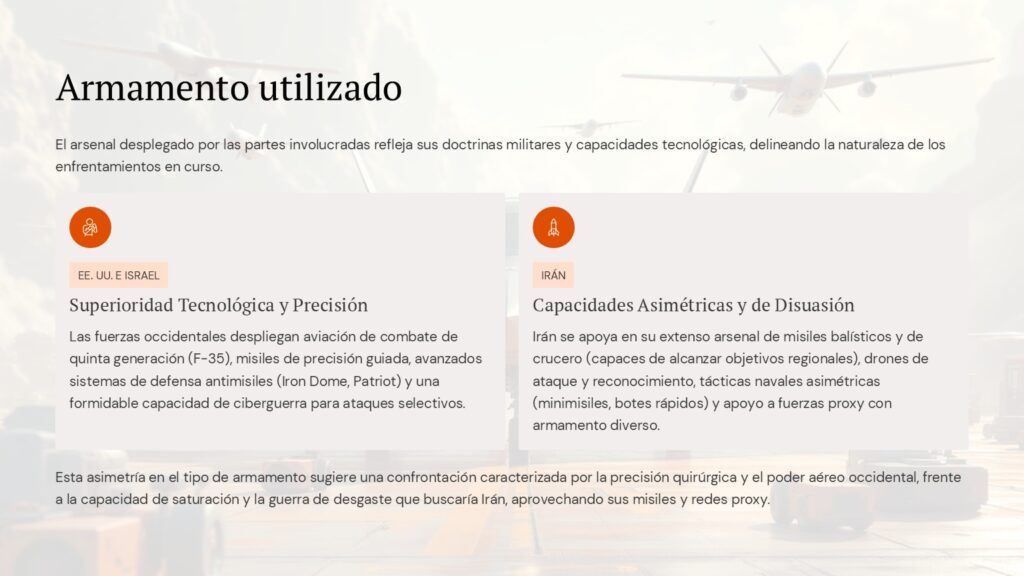 | Israel | Neutralizar amenaza nuclear iraní, debilitar red de milicias proiraníes | Participación directa en operaciones | Riesgo de guerra en múltiples frentes |