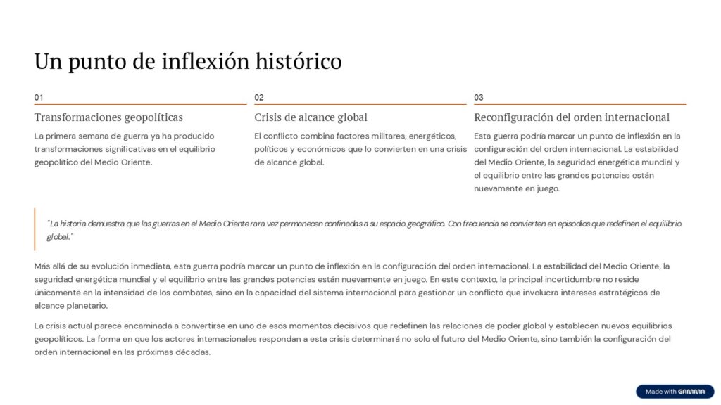 Más allá de su evolución inmediata, esta guerra podría marcar un punto de inflexión en la configuración del orden internacional. La estabilidad del Medio Oriente, la seguridad energética mundial y el equilibrio entre las grandes potencias están nuevamente en juego.