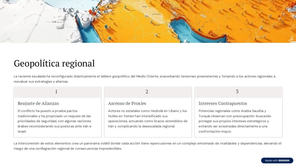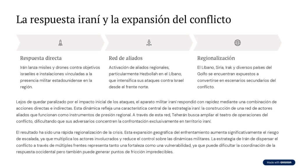 Esta dinámica refleja una característica central de la estrategia iraní: la construcción de una red de actores aliados que funcionan como instrumentos de presión regional. A través de esta red, Teherán busca ampliar el teatro de operaciones del conflicto, dificultando que sus adversarios concentren la confrontación exclusivamente en territorio iraní.