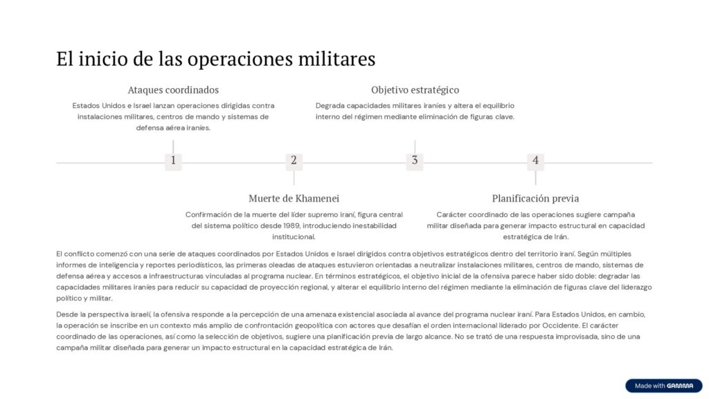 El carácter coordinado de las operaciones, así como la selección de objetivos, sugiere una planificación previa de largo alcance. No se trató de una respuesta improvisada, sino de una campaña militar diseñada para generar un impacto estructural en la capacidad estratégica de Irán.