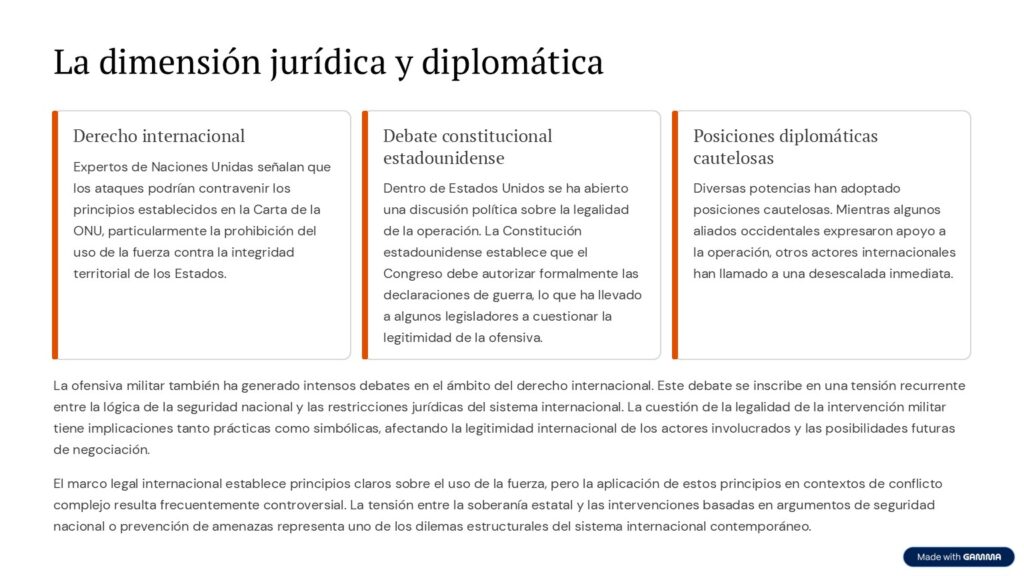Al mismo tiempo, dentro de Estados Unidos se ha abierto una discusión política sobre la legalidad de la operación. La Constitución estadounidense establece que el Congreso debe autorizar formalmente las declaraciones de guerra, lo que ha llevado a algunos legisladores a cuestionar la legitimidad de la ofensiva.