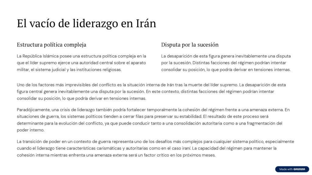 Paradójicamente, una crisis de liderazgo también podría fortalecer temporalmente la cohesión del régimen frente a una amenaza externa. En situaciones de guerra, los sistemas políticos tienden a cerrar filas para preservar su estabilidad.