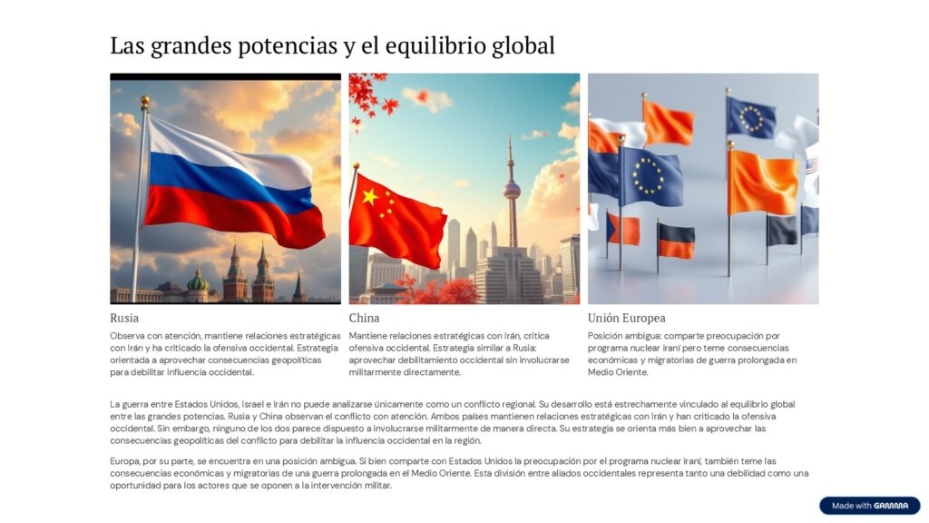 La guerra entre Estados Unidos, Israel e Irán no puede analizarse únicamente como un conflicto regional. Su desarrollo está estrechamente vinculado al equilibrio global entre las grandes potencias.